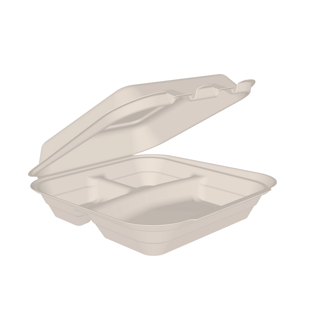 HC8SC3PF White 8"x8"x2.6" PFAS Free Bagasse 3 Compartment Hinged Container 6/50 cs